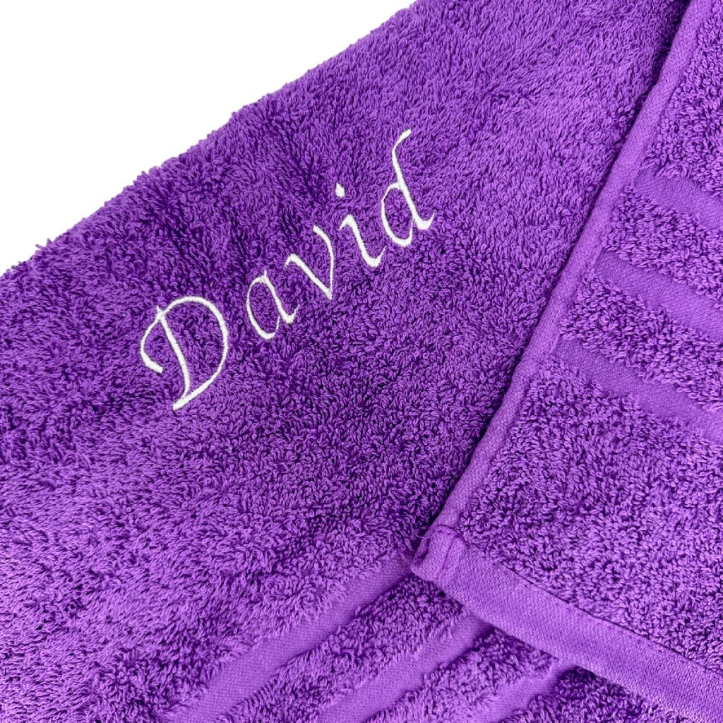 Fialová froté plážová osuška s vlastním vyšívaným textem velikosti 100 x 180 cm